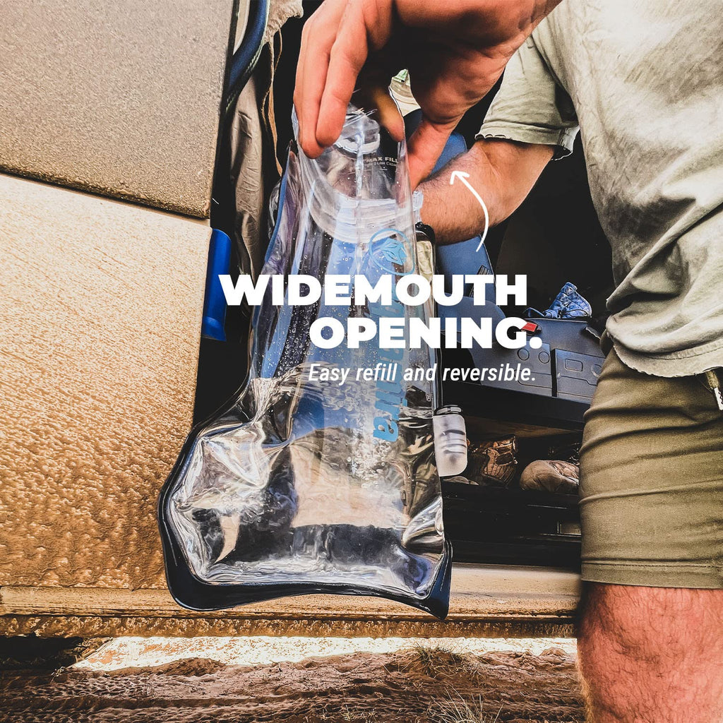 Remove the slide top and easily refill from any river, stream, lake, or pond. Protect your thirst by plugging an Aquamira Frontier Filter inline via the built in quick connects and have a complete hydration and filtration system anywhere you go.