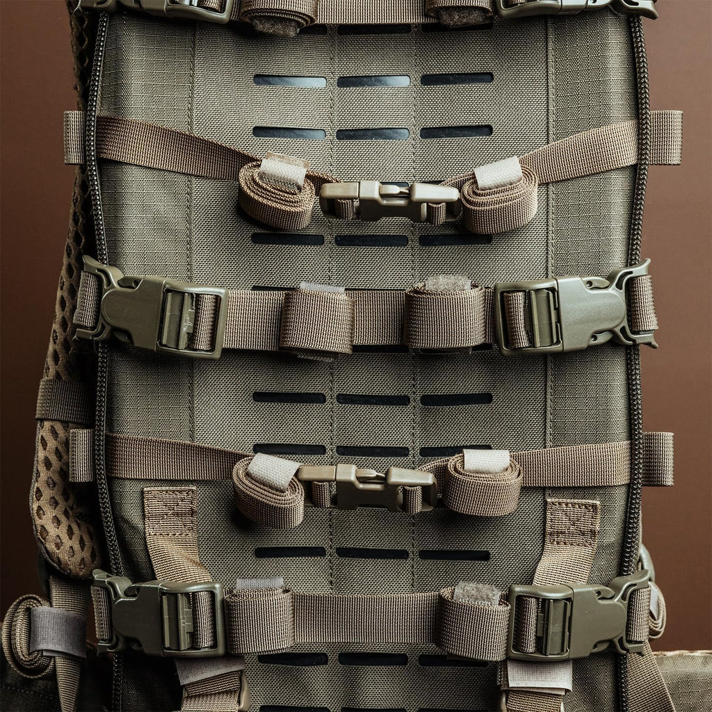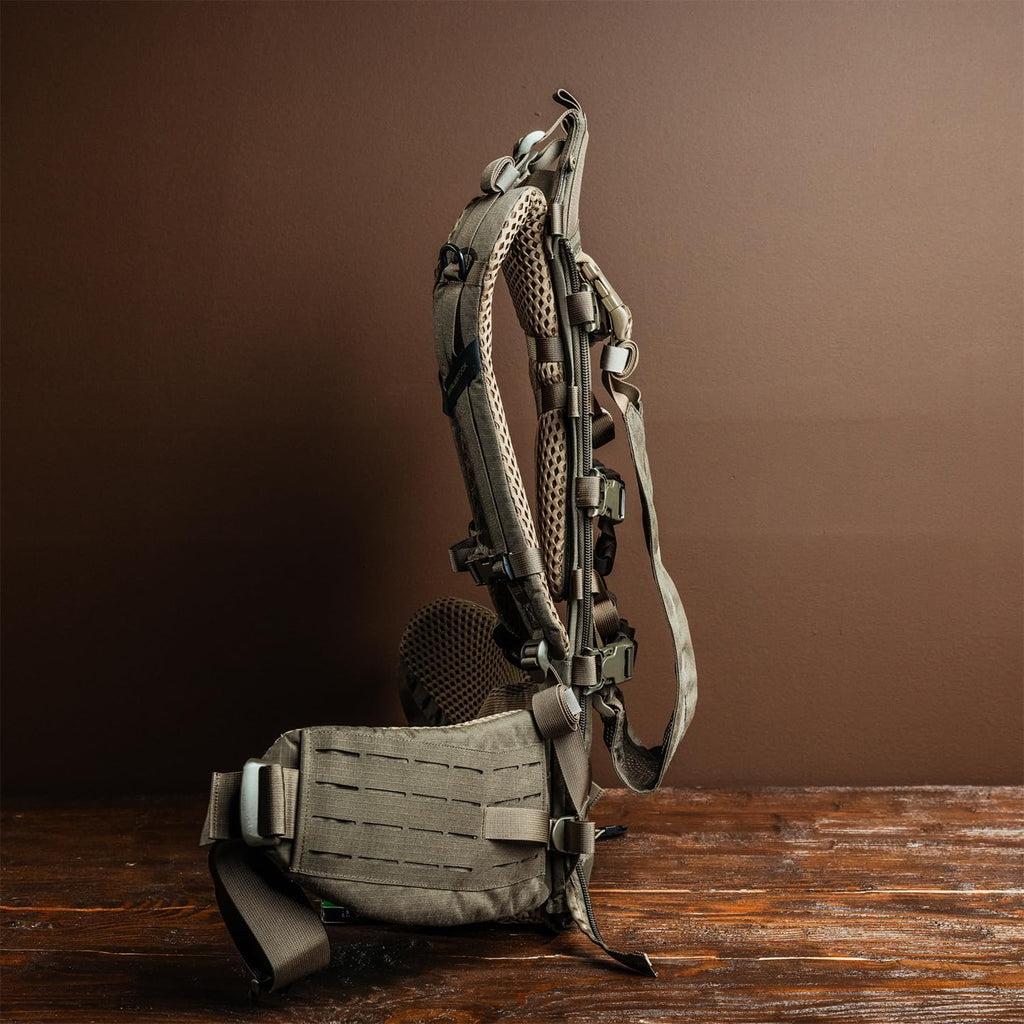 Built around a rugged aluminum frame, the system includes adjustable lumbar padding and a pull-forward hip belt with laser-cut MOLLE for modular attachment options. The fully adjustable shoulder harness allows for a tailored fit, and the entire system is EMOD compatible, giving you the flexibility to expand or customize your setup as needed.