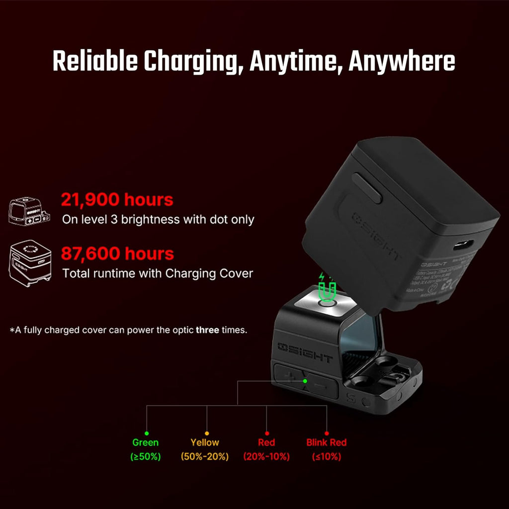 - [Industryʼs First Magnetic Charging Cover] The Osight S introduces an innovative Magnetic Charging Cover with an integrated battery display, providing real-time battery status for both the cover and the optic—eliminating guesswork with precision.