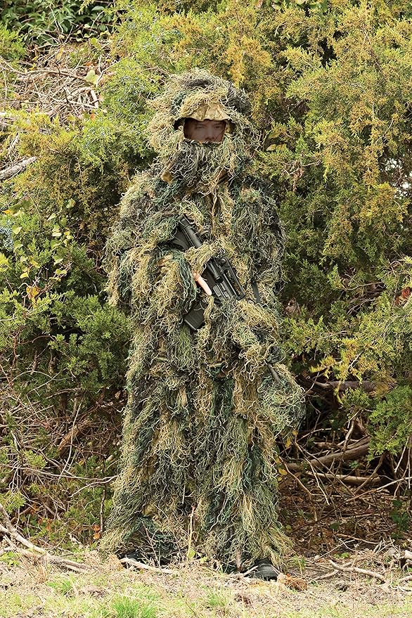 5-Piece Hallie Suit includes: jacket, hood, pants, gun wrap, and stuff sack with carry strapEasy On/Off: Elastic pant waist with drawstring; Elastic jacket cuffs; Adjustable chin strap in hood; Easy snap-closure jacket; Snap-closures at anklesStitched opening in chillier pants and jacket allows access to pockets underneathAvailable Sizes: M/L (Chest 42”- 48”; Waist 32” - 38”) LRG/XLRG (Chest 48”- 56”; Waist 38”- 46”)Lightweight and breathable polyester construction; 98% polyester 2% spandexIncludes One Adult Men's Size Medium/Large Ghillie Suit